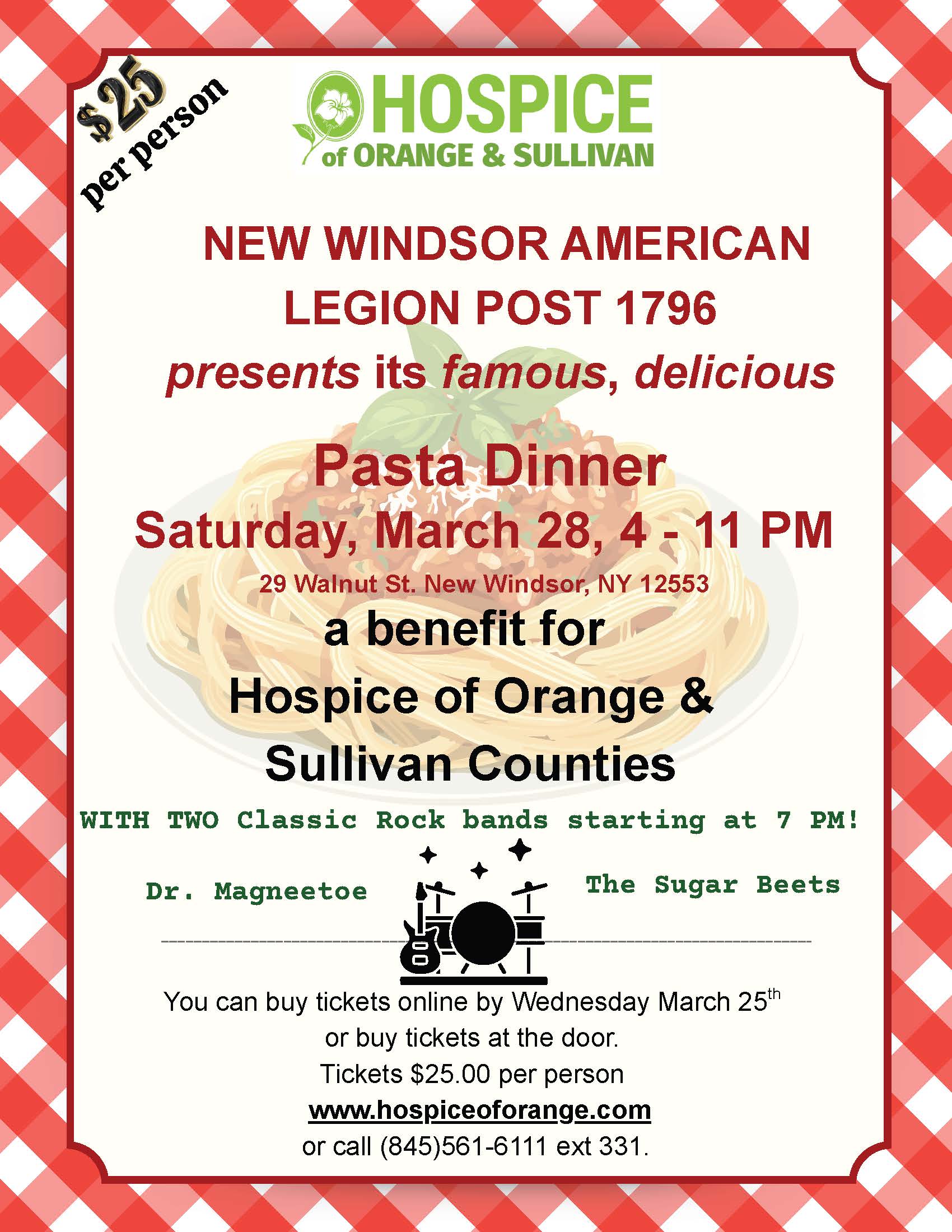 Announcing the famous New Windsor American Legion Pasta Dinner – to benefit Hospice of Orange and Sullivan Counties! Join us by buying your homemade dinner at the door from 4 – 10 PM, and enjoy two classic rock bands, all on Saturday, March 28 at 29 Walnut Street, New Windsor, NY 12553!